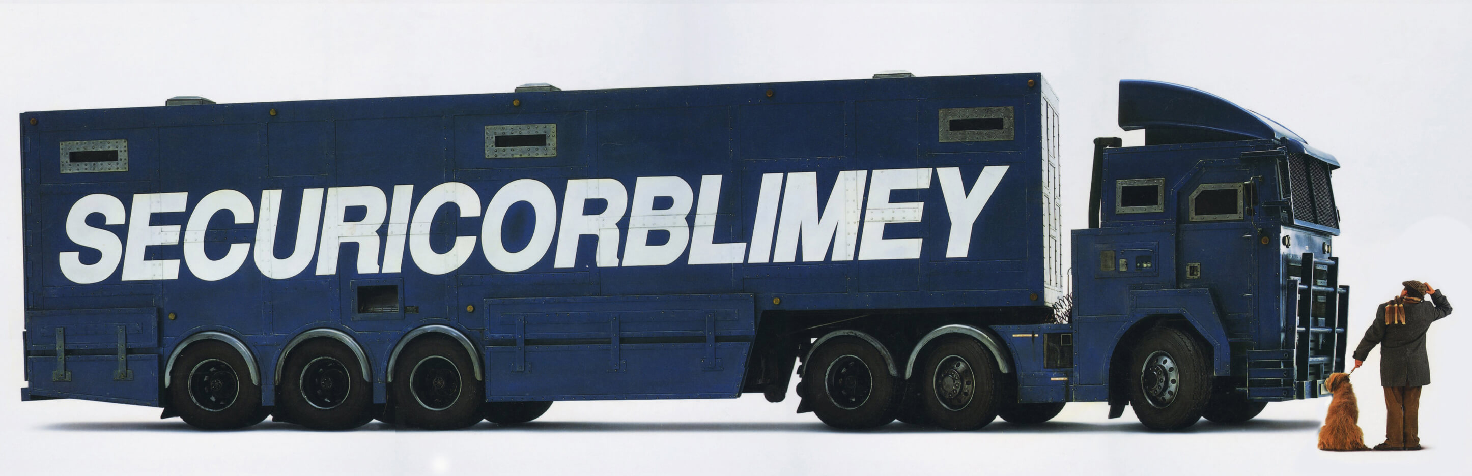 This enormous truck was in fact only 9 feet long, the rivets you see along the sides are pin heads. The man and dog were applied in a post production.